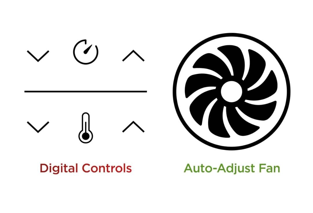 - قلي خالٍ من الزيوت (مقلاة هوائية) – زيت أقل بنسبة تصل إلى 75% مقارنة بالقلي التقليدي (تم اختباره ومقارنته بالبطاطس المقلية المقطعة يدويًا مع القلي التقليدي.)